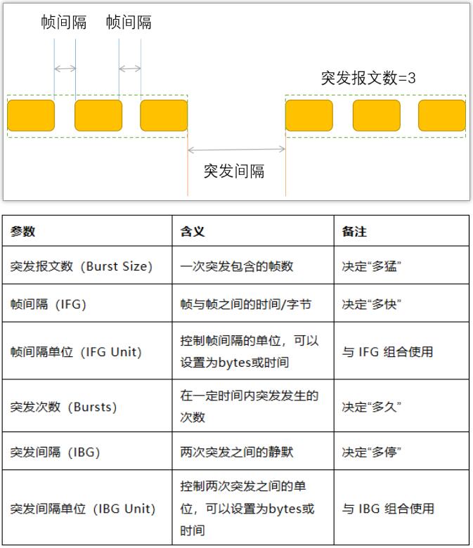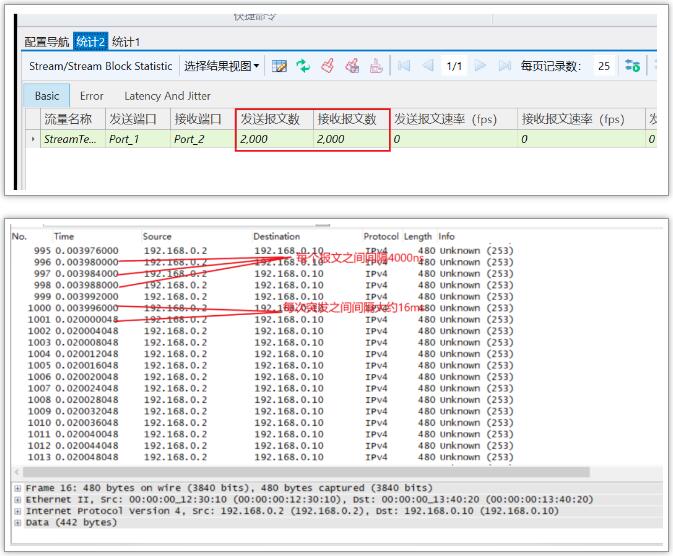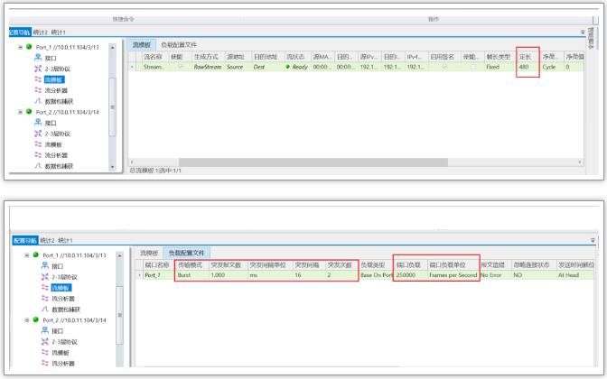 在1G端口的端口模式下創(chuàng)建一條480 Bytes線(xiàn)速突發(fā)流量,打4 ms,停16 ms(突發(fā)間隔),發(fā)送2次突發(fā)流。