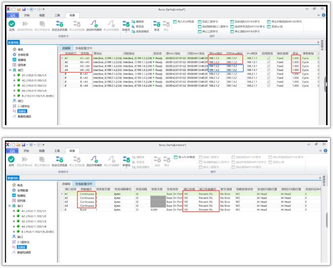 2. 性能測(cè)試儀與DUT板卡A相連的m個(gè)端口兩兩一對(duì),互發(fā)線(xiàn)速背景流(包長(zhǎng)1000bytes)。
