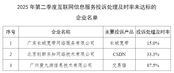 在互聯網信息服務投訴方面,2025年第二季度,互聯網信息服務投訴平臺收到的互聯網用戶投訴中,服務功能類投訴占比48.2%,個人信息保護類投訴占比19.7%,客服渠道類投訴占比17.3%,其他類投訴占比14.8%。在接入平臺的178家互聯網企業中,廣東長城寬帶等3家企業投訴處理及時率較低,工信部已督促相關企業妥善處理用戶反映的問題。