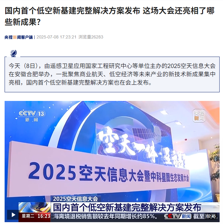 7 月 8 日消息,據央視新聞報道,由遙感衛星應用國家工程研究中心等單位主辦的 2025 空天信息大會于今日在安徽合肥舉辦,一批聚焦商業航天、低空經濟等未來產業的新技術新成果集中亮相,國內首個低空新基建完整解決方案也在會上發布