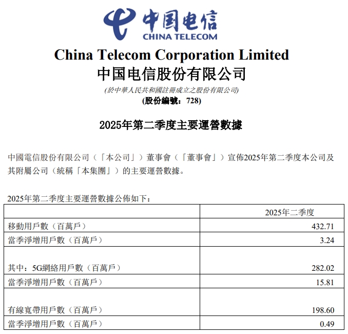 數(shù)據(jù)顯示,2025年第二季度,中國電信移動用戶總數(shù)達(dá)到4.3271億戶,第二季度凈增用戶數(shù)324萬戶;5G網(wǎng)絡(luò)用戶數(shù)達(dá)2.8202億戶,本季度凈增1581萬戶;有線寬帶累計(jì)用戶數(shù)達(dá)1.986億戶,本季度凈增49萬戶。