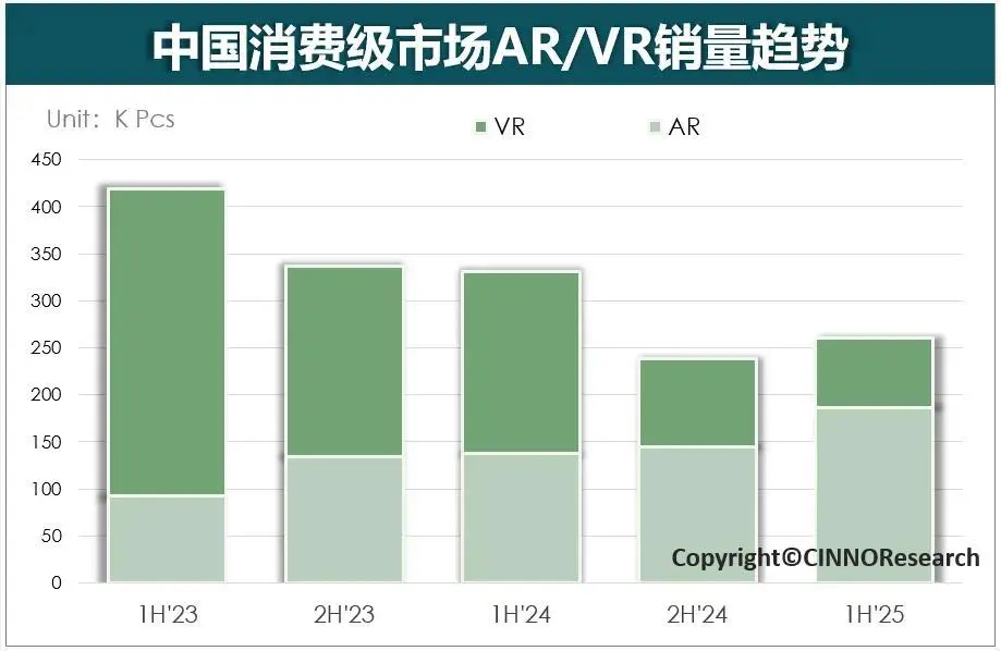 8月19日,CINNO Research發(fā)布數(shù)據(jù)顯示,2025年上半年國內(nèi)XR消費級市場整體銷量達26.1萬臺,環(huán)比增長9%,但同比下滑21%,市場呈現(xiàn)明顯分化態(tài)勢 ——VR設(shè)備銷量陷入低谷,AR設(shè)備則保持高速增長。