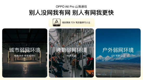 OPPO A6 Pro 采用旗艦級山海通信全套解決方案,帶來行業最強弱網通信體驗。針對地庫、電梯、山區等信號薄弱場景,山海射頻天線通過天線設計革新,低頻信號收發能力提升 200%,整體信號強度達前代 2 倍。即使在完全無信號環境下,A6 Pro 還可通過藍牙與其它 OPPO 手機進行通信,支持語音、文字及圖片傳輸,成為戶外應急的“保底”聯絡工具。