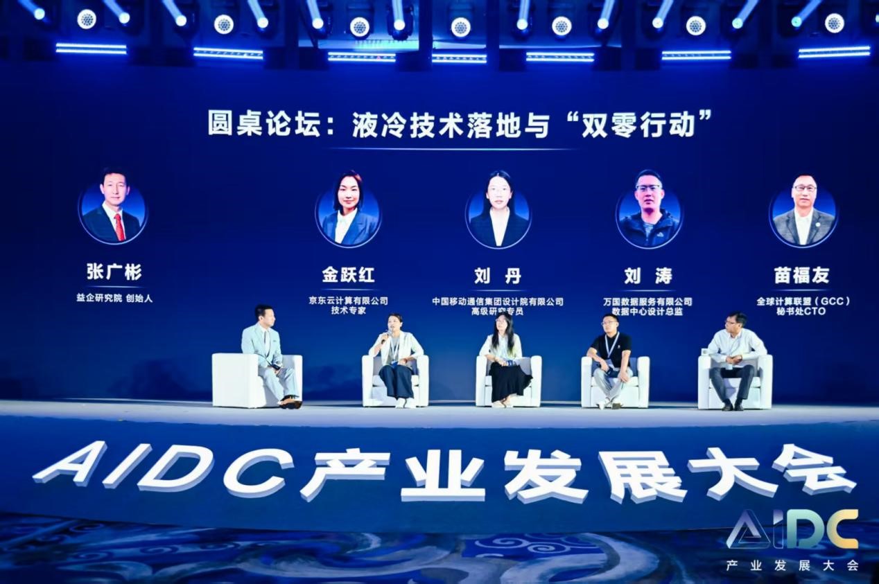 大會最后,在益企研究院張廣彬的主持下,京東云計算有限公司金躍紅、中國移動通信集團設(shè)計院有限公司劉丹、萬國數(shù)據(jù)服務(wù)有限公司劉濤、全球計算聯(lián)盟(GCC)苗福友等嘉賓齊聚圓桌論壇,共同探討AIDC的未來發(fā)展。圍繞液冷技術(shù)落地,嘉賓們深入剖析了液冷泄漏、冷板堵塞腐蝕等挑戰(zhàn),并就如何解決液冷工質(zhì)與材料兼容性問題展開討論。此外,嘉賓們還分享了“雙零行動”的創(chuàng)新實踐與最新進展,為AIDC的未來發(fā)展提供思路與指引。