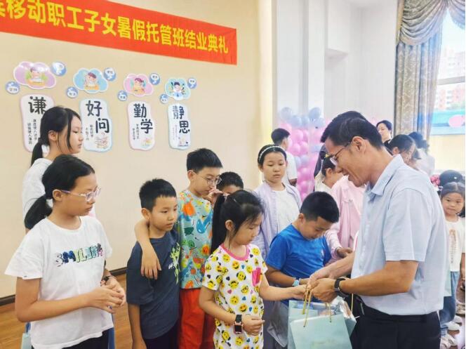 畢業(yè)典禮現(xiàn)場充滿童趣與溫情,哈爾濱移動工會主席為每個孩子送上了一份開學(xué)禮物并發(fā)表致辭,回顧了托管期間的點點滴滴。他提到,本次托管班圍繞“安全、快樂、成長”三大核心,不僅為孩子們安排了作業(yè)輔導(dǎo)、興趣拓展、趣味運動等活動,還讓孩子們在輕松氛圍中收獲知識、結(jié)交伙伴、提升能力。