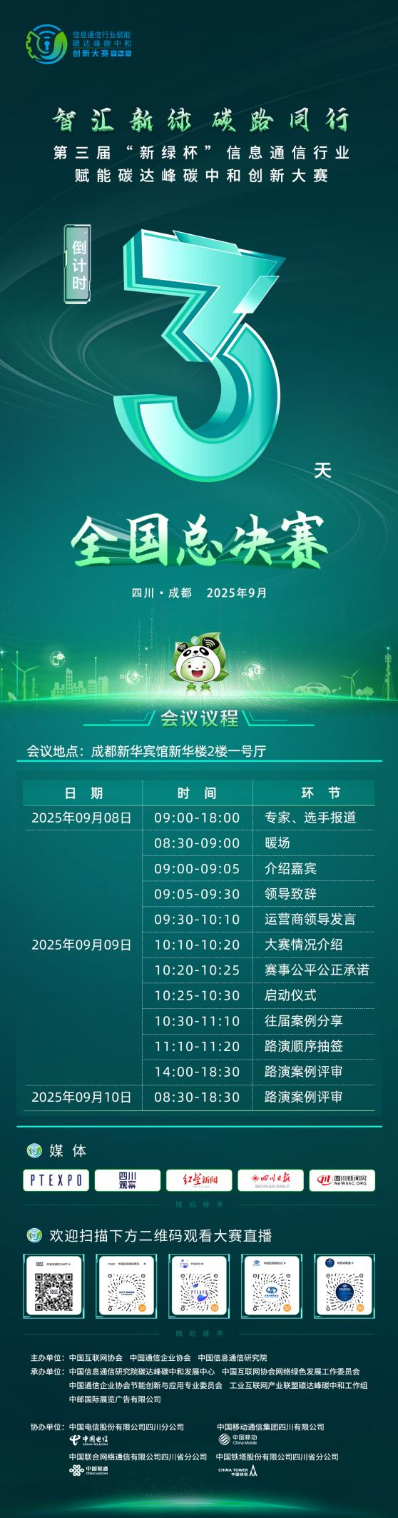 第三屆“新綠杯”信息通信行業賦能碳達峰碳中和創新大賽全國總決賽將于9月9日、10日在四川成都隆重舉行。目前,大賽已進入最后三天的倒計時階段,各項籌備工作基本就緒,一場聚焦信息通信技術與綠色低碳發展深度融合的創新盛宴即將拉開帷幕。